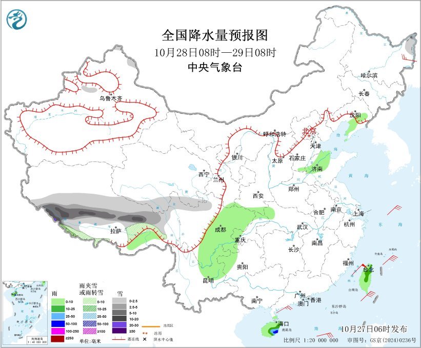 10月28日08时至29日08时,西藏中南部、青海南部、川西高原北部等地部分地区有小到中雪或雨夹雪,其中,西藏中部等地部分地区有大到暴雪,局地大暴雪。辽东半岛、西藏东南部、黄淮东部、西南地区东部、海南岛、台湾岛等地部分地区有小到中雨,其中,海南岛东南部、台湾岛东部等地部分地区有大雨,局地暴雨。黑龙江东北部部分地区有4~5级风;台湾海峡将有7~8级、阵风9级的东北风,东海南部海域、台湾以东洋面、巴士海峡、北部湾、琼州海峡、南海北部和中西部海域将有5~7级、阵风8级的东北风。